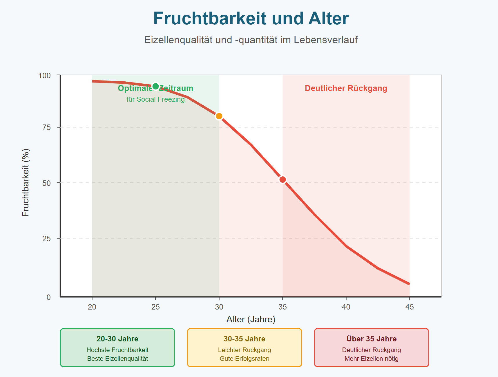 Die Fruchtbarkeit der Frau ist altersabhängig und nimmt mit zunehmendem Alter kontinuierlich ab. Dies betrifft sowohl die Anzahl als auch die Qualität der Eizellen. Während Frauen in ihren Zwanzigern über die höchste Eizellenreserve und -qualität verfügen, beginnt ab Mitte 30 ein deutlicherer Rückgang.
